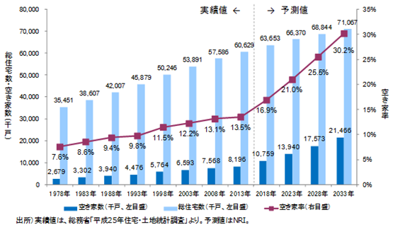 空き家の数は全国で820万戸(2013年)にのぼり、全戸数の約13.5%を占め、人口減を背景に空き家は今後さらに大幅に増える見通しです。野村総合研究所のレポートによると2033年に、全戸数の30.2%の約2,200万戸近くが空き家になると予測されています。空き家を放置していると、固定資産税などの維持コストがかかるばかり。何か対策を講じなければ大変です。阪神間など立地が良ければ空き家を賃貸に回して家賃収入を得られる方法があります。また、思い入れのある家は手放しづらいですが、非課税枠などを使い売却するのも選択肢になります