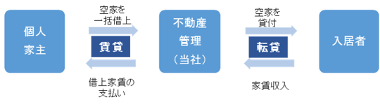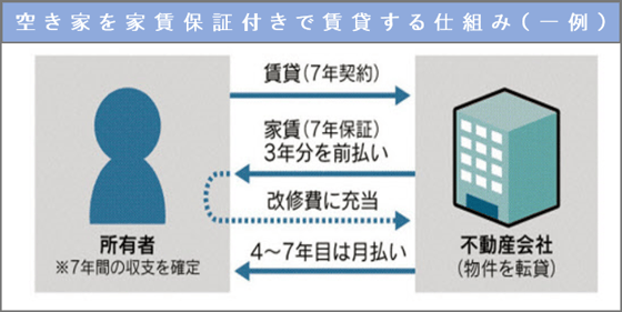 その点を解決した「空き家の借り上げ(サブリース)」サービスもあります。例えば原則7年分の家賃収入を保証し、その一部を前払いする仕組み(下の図)。