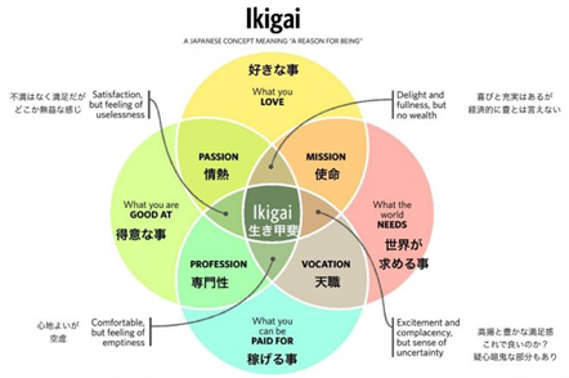 が重なり合った中心に「ikigai」生きがいがあると説いています。 図は書籍の中にも描かれているのですが、このコンセプトが 世界の人々を強く魅了しています。 私たちは生きがいを見つけるために、自分自身の興味や価値観、能力、経験などを考慮しながら、自分に合った生き方を模索することが重要です。また、健康的なライフスタイル、社交的なつながり、自己啓発、そして積極的な考え方なども、生きがいを見つける上で役立つ要素となるでしょう。しかし、生きがいは人によって異なるものであり、自分にとっての生きがいを見つけるためには、自分自身と向き合い、自分の内面を深く探求する必要があります。その上で、自分にとって本当に大切なことを見つけ出し、それに向かって行動することが、生きがいを見い出すための第一歩となるでしょう。
