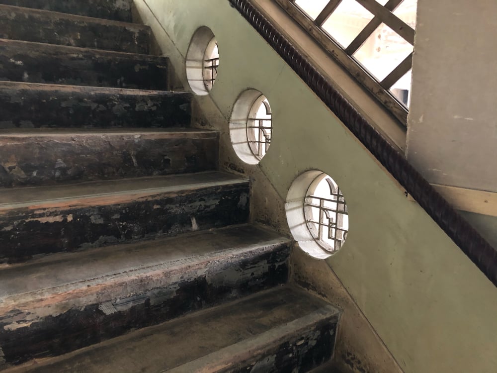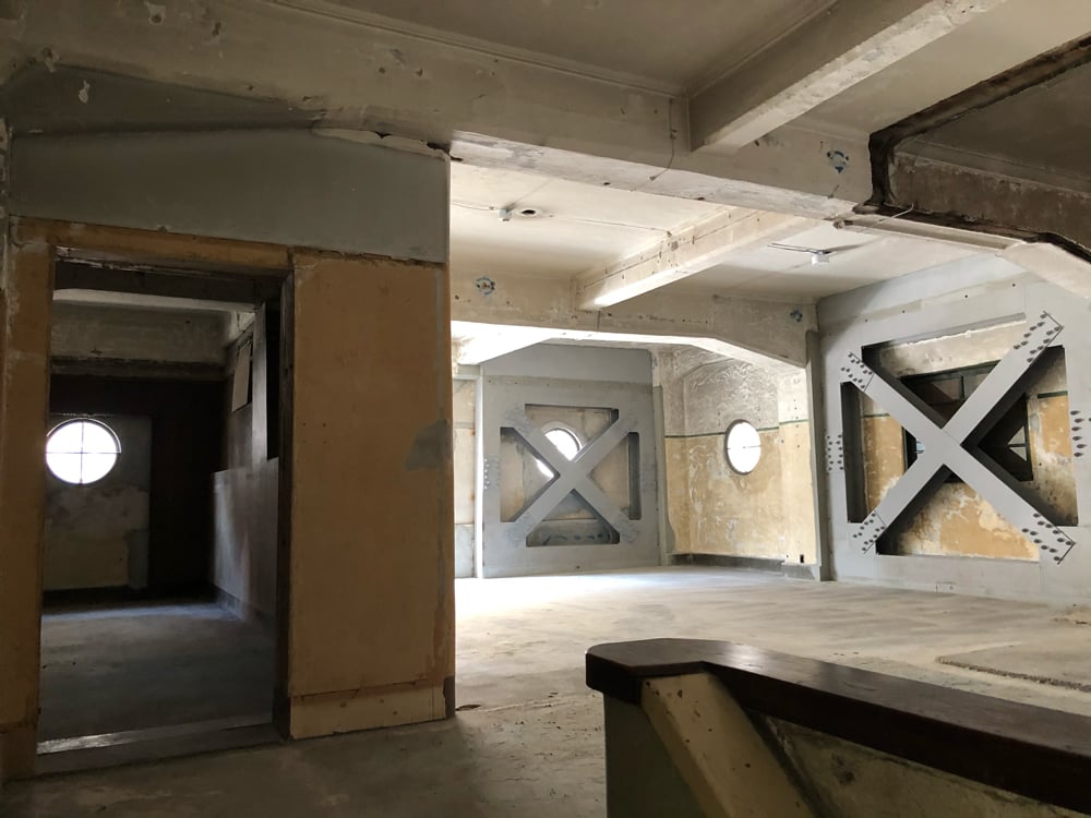 内部はこれから内装工事ですが工事中に出てきた階段周りの装飾や室内の雰囲気などなるべくそのまま残しています。