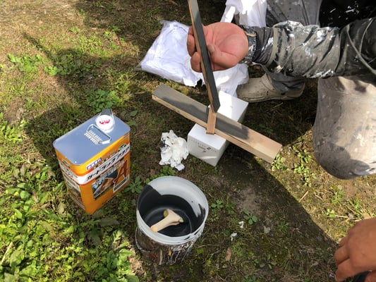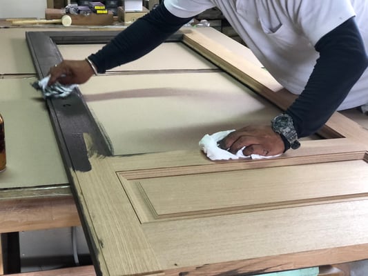 2020年 · 11月 20日, 2020年 オーク無垢材の親子ドア 丹波まで建具制作の建具屋さん工房までお出かけ 貴重なオーク無垢材にイメージ通りの塗装をする為に塗装屋さんも来てもらって打合せ むちゃ良い建具を建具屋さんが作ってくれました。 普通に塗ったら木目が目立たなくなるから一瞬クリア塗装だけにしようかと悩んだけどグレー色を刷毛塗りしながらウエスで拭き取り。 木部の部材によって塗料ののり方が違うから拭き取る時間も小まめに調整しながら拭き取ることに! 塗装屋さんもいつもワガママ聞いてくれてありがとう! オーク無垢材の木目と質感が最高のドアになりました。 tagPlaceholderカテゴリ: